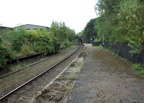 ![]() New Hey station looking north west along the former up platform in September 2009. The disused former Rochdale platform is on the left. It was taken out of use in 1980 when the line was singled.