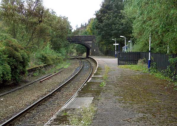 New Hey station looking north west along the former up platform in September 2009. The disused former Rochdale platform is on the left. It was taken out of use in 1980 when the line was singled.