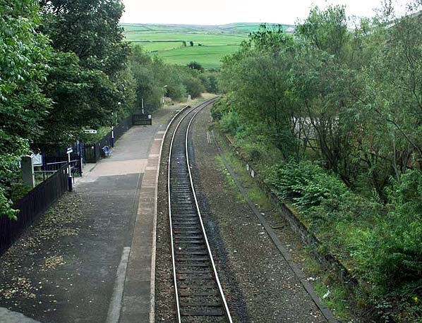 ![]() New Hey Station looking south east from the Huddersfield Road in September 2009. Both of the platforms can clearly be seen in the picture but the former down platform to the right, had been out of use since 1980 when the line at this location was singled.