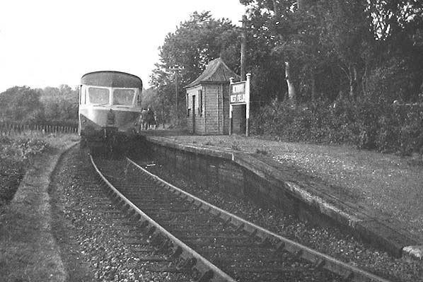 Diesel Railcar heading for Newbury waits at Newbury West Fields Halt Photo by D. W. Winkworth supplied by The Lambourn Valley Railway web site