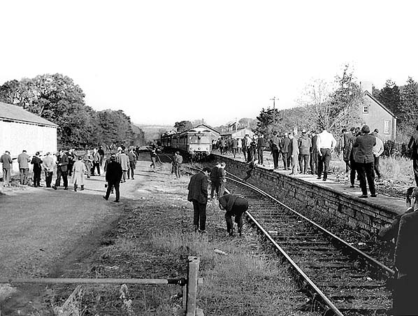 ![]() Station Name: NEWCASTLE EMLYN![]() The WRS Central Wales Railtour. at Newcastle Emlyn station on 17 November 1968. This view is looking north-east from the buffer stops. The station building, which was demolished in 1966, was on the right. Photo from Courtney Haydon collection ![]()