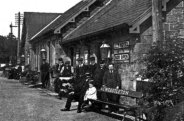 ![]() Newcastleton station staff in early 1920s. Station Master Simon Bell is sitting on the bench with his daughter.