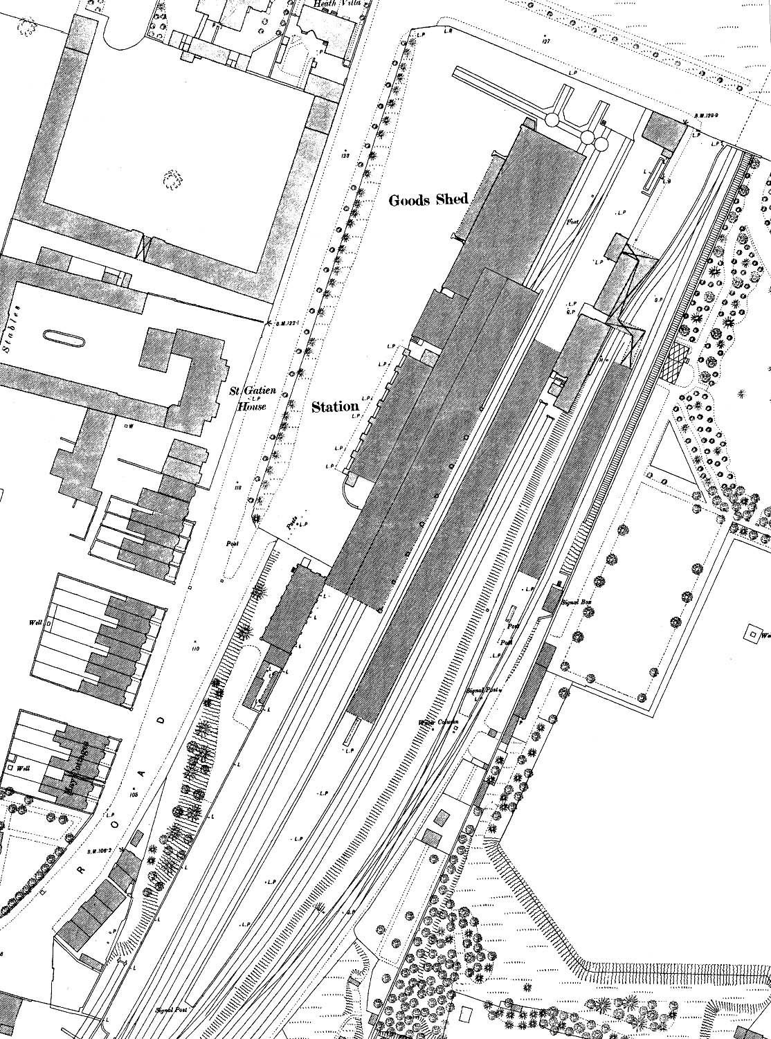 ![]() 1885 1:500 OS Town Plan shows the layout of the station after the through island platform had been added. The goods shed is located beyond the passenger trainshed which spans the original single platform. The later island platform is seen to the right of the trainshed; the shaded area indicates the extent of its canopy. To the right of that, the 1879 through island platform is seen, again with a canopy for weather protection. A footbridge is sited at the north end of the through platform to the high level island platform. Home Page