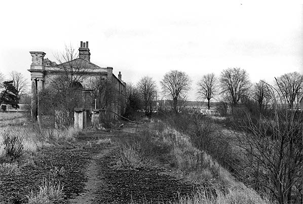 Newmarket station looking north along the overgrown main passenger platform in March 1981, shortly before demolition.Photo by John Atfield Home Page