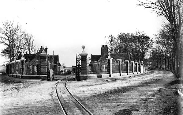 The Cheveley Park private narrow gauge railway line leaving the lower Park Gates on its wayto the old station. Photo from Newmarket Local History Society The small narrow gauge locomotive and wagons used to haul building materials from Newmarket station can be seen left centre.Photo from Cheveley web site Home Page