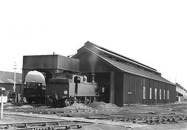 Newport engine shed c. 1930. The 2-road shed was opned by Ryde & Newport Railway 20 December 1875 and closed 4 November 1957. Photofrom Roger Griffiths collection