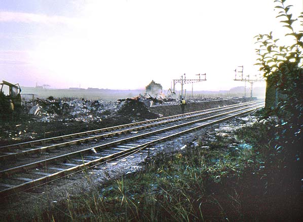 ![]() On 13 December 1972 demolition is under way at Newsham. This view looks south-eastwards along the remains of the down platform on the Bedlington line; only the waiting shelter, seen on the extreme right, survives. The face up platform has been demolished in the foreground and the south-eastern end cut back; its buildings have been almost entirely demolished, and timber from them is being burned. A railwayman in a ‘hi-vis’ jacket and hard hat is admiring his achievements.