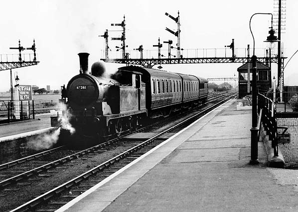 ![]() 67261 on a push-and-pull at the up ‘main line’ platform at Newsham. The subway entrance on the down platform, where the photographer was standing, is in the right foreground, constructed of white glazed bricks to reflect as much light as possible. The ‘Sugg’ gas lamps are recent additions by BR(NE) replacing those of casement design. One on the left carries a nameplate, possible of BR(NE) origin since it was LNER practice to add them only when electric lighting was installed. The ‘Newsham change for Blyth’ is a standard LNER fixture. Beyond the signal gantry is Newsham South box, and in the background are the sidings intended for storage and handling of freight wagons, notably of coal: the life-blood of the former Blyth & Tyne.