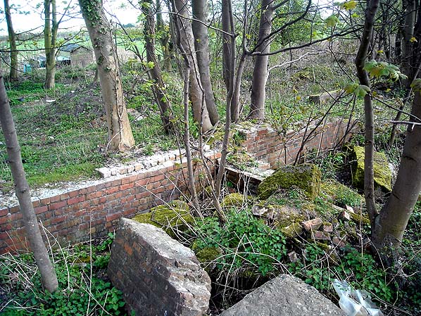 Kyme was split; the main yard with a goods shed was behind the down platform but the coal drops were on the north side of Wetherby Road. The remains of the coal cells can still be seen in April 2013.