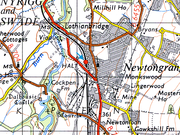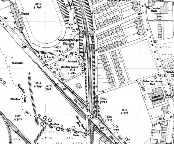 There were no goods facilites at Newtongrange or Dalhousie, the station it replaced. Despite being sited in an expanding residential area, Newtongrange was downgraded to the status of an unstaffed halt from 5 December 1960, an earlier date than any of the other stations on the Waverley route. The word ‘Halt’ never appeared on tickets or signs or in timetables but it was shown as a 'Halt' on OS maps (see below).