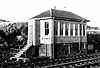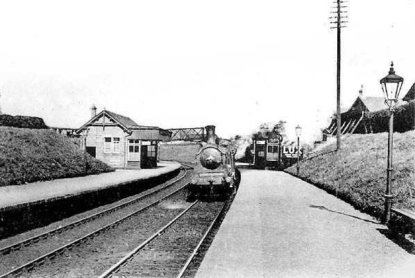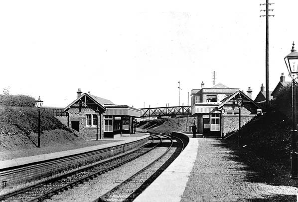 The station had two facing platforms with an unusual two-storey stone building with a hipped slate roof. The booking office was on the upper level accessed from a forecourt at the end of Station Road. On the far side of the building there was a bay window jutting out over the platform allowing the staff in the booking office to look along the line in both directions. A door in the side wall opened onto steps down to the up platform while another door opposite the entrance led onto a footbridge spanning the cutting with steps to the down platform. There were substantial brick waiting rooms with toilets and canopies on both platforms.