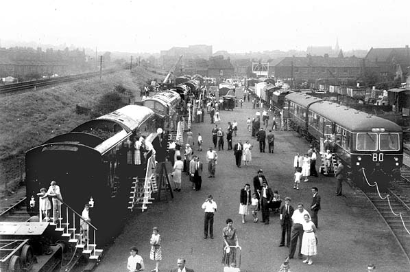 An exhibition of locomotives and rolling stock in Noel Park goods yard between 12th and 14th September 1958. 'Mallard' is seen in the foreground on the left. Photo by Kenneth Boyer Smith