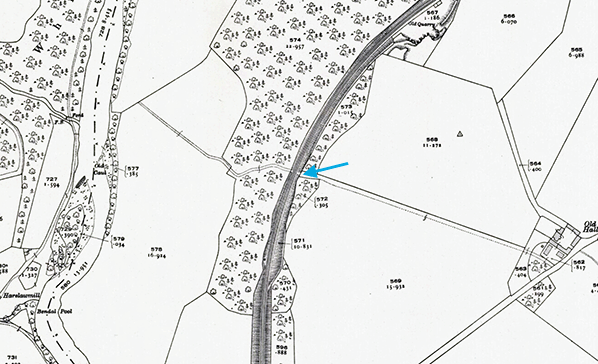 The exact position of Nook Pasture is not known but it has been suggested that the most likely position is where a public footpath from 'Old Hall' heads west to cross the trackbed before continuing down towards the Liddel Water. East of 'Old Hall' a bridle path leads to Nook Farm. By these paths the suggested station site is about a mile from the farm. Some 200 yards north of the crossing-place a level area adjoins the trackbed where there could have been a siding for loading.