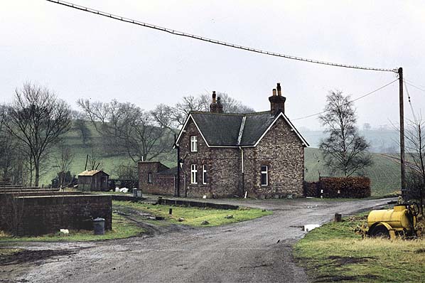 ![]() North Grimston Station in February 1978. The original station with the new stationmaster's house is seen on the left side of the level crossing. The coal drops can be seen on the left. The position of the siding to the loading dock (on the other side of the road) can be seen in front of the coal drops.