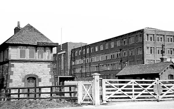 Photo by Bill Shillcock courtesy of the Cumbrian Railways Association [CRA SH1073] ![]() he site of North Lonsdale Crossing station looking north-east c1960. The signal box is still in good repair although its nameboard is in need of some paint. The Glaxo pharmaceuticals factory stands in the background. The single-storey brick building with shaped bargeboards and partly obscured by the crossing gates is of interest. Its position and design suggest that it might have been the station building..Photo by George Taylor from the Peter Robinson collection, courtesy of the