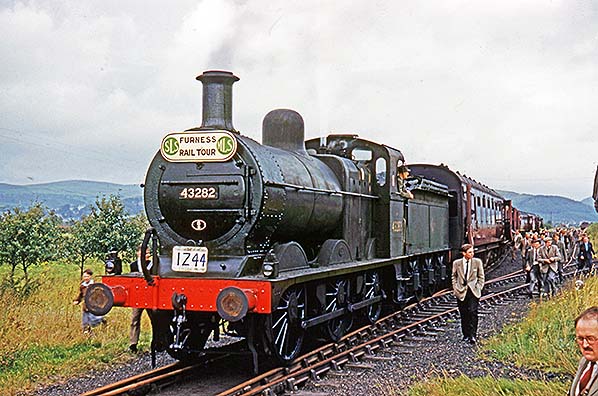 Photo by Alan Headach courtesy of the Cumbrian Railways Association [HEA074] ![]() On 27 August 1961 the ‘Furness Railtour’ organised by the Stephenson and Manchester Locomotive societies from Lancaster is seen at North Lonsdale Crossing just after noon, allowing passengers to stroll and take photographs before going on to visit some other outposts of the railway network, including Ramsden Dock and Island Road stations in Barrow and the Hodbarrow and Coniston branches. The locomotive is Johnson Class 3F 0-6-0 No.43282 built in 1891 by Neilson & Co of Glasgow. She would be withdrawn from 8B, Warrington Dallam shed in October 1962.