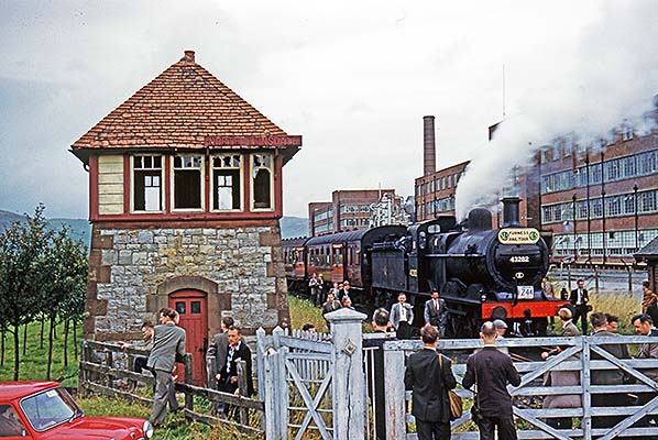 ![]() The ‘Furness Railtour’’ at the site of North Lonsdale Crossing station on 27 August 1961, looking north from the level crossing. The splendid signal box, sadly in a state of disrepair, and the extensive Glaxo pharmaceuticals factory compete for attention with the locomotive which is Johnson Class 3F 0-6-0 No.43282.