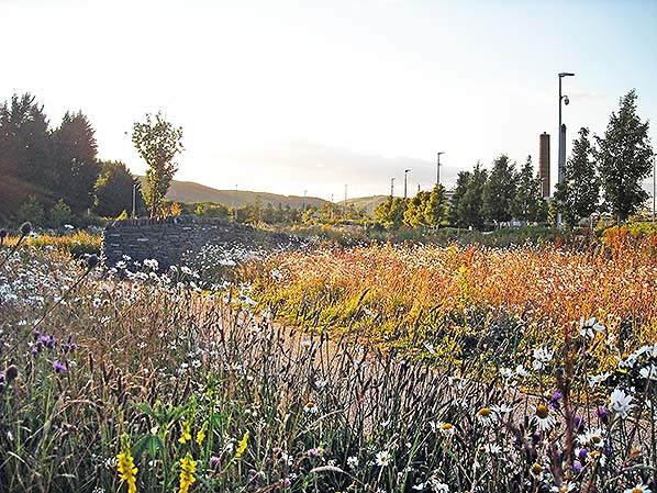 ![]() Sunset over North Lonsdale Crossing on 2 July 2019. The view is looking north at the site of the level crossing and shows a completely transformed landscape which was completed in 2015. On the former trackbed here is the GSK Memorial Garden resplendent with wild flowers. A broad service road (its lamp standards visible to the right) gives access to the Glaxo-Smith-Klein pharmaceuticals factory whose chimneys are seen in the background. The firm has fashionable modern buildings in contrast to the structures, fashionable in their day, which were seen on the 1950s and '60s photographs.