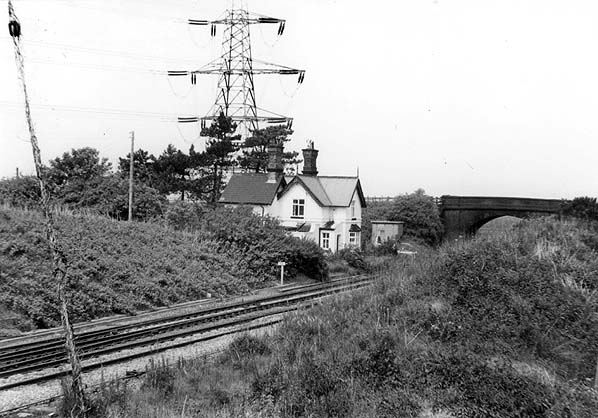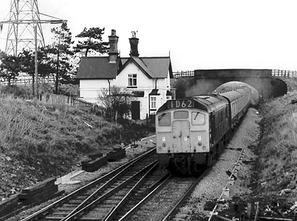![]() Looking north-east at Norton station in the early 1970s after the stations platforms had been removed. The train, hauled by a Sulzer type 2 diesel (Class 25) was en-route to either Llandudno or Holyhead.
