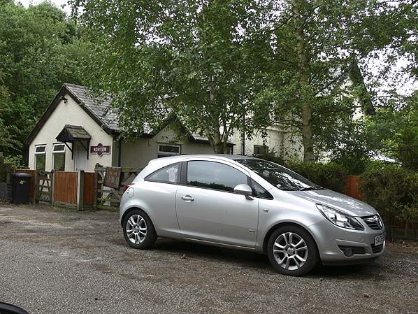 Norton station seen from the station approach road in June 2010. A period LMS target sign, possibly an original, has been fitted to the modern extension which occupies the site of the ticket office