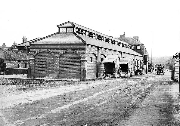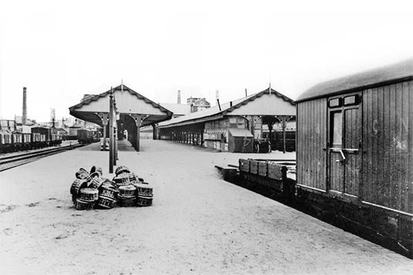 ![]() Norwich City station looking towards the station building on a unknown date but perhaps within the first two decades of the twentieth century. Dominating the scene is Platform 1 on the east side of the station. The centre track is the locomotive release road while at far left is the Down side siding, part of the station's goods facilities. The rails appear to be short lengths, probably twenty feet as was once quite common. In the left background can be seen the entrance arch through the station building which led directly onto what is usually known as a cab road between the two platform canopies, the bay platforms at Norwich City being located further north, to the right of the camera. The 'cab road' in this case seems to have been mostly used for goods and, as it happens, an interesting selection of loaded road vehicles may be seen. Some of these vehicles are single axle low-loading types while at least one of the two axle vehicles has rubber, albeit solid, tyres. The latter type was commonly hauled by road locomotives, i.e. steam traction engines. On the nearest platform are seen stacked boxes and crates, strategically positioned ready for loading onto a train. Just visible are the 'EMR' (Eastern & Midlands Railway) monograms cast into the spandrels supporting the canopy. Each spandrel is identical but their mounting on opposite sides of the stanchions means one monogram of the pair is reversed, meaning that one can be seen right-way-round either side of a stanchion. This was common practice among most railway companies, being by default the result of using a single casting mould. Platform lighting, just visible beneath the canopy, is of the casement type and something of a mystery regarding dates, as other photographs, some later and some thought to be earlier, show suspended globe type lighting.
