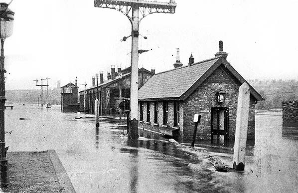 Photo from John Mann collection ![]() Norwich City station was always prone to flooding sitting, as it did, a little above the normal level of the adjacent River Wensum. The year 1912 was a particularly wet one for Norfolk and on Monday 26 August the already sodden ground was subjected to 7.34 inches of rainfall, which equals three months average rainfall for the region. The Yare burst its banks and the Wensum became a raging torrent with parts of Norwich disappearing under four feet of water within three hours. This scene believed to have been taken the following day, Tuesday 27 August looks north from the east platform and shows a considerable depth of water around the enginemen's mess-room, the shed and Norwich City South signal box. The river, when not in flood, flowed behind the engine shed. The south signal box is seen close to the engine shed; a second north box was located on the east side of the