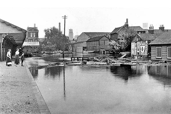 approach to the station. Photo from John Mann collection ![]() Three people look over the west platform towards the timber yard at Norwich City in August 1912, surveying the extensive flooding.