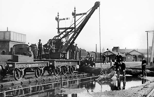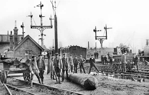 Photo from Jim Lake collection ![]() This and the following two views show the cleaning-up operation following the flooding of 27 August 1912. It is probably a day or two later as most of the water has now receded. In the foreground a group of workers pose with a tree trunk which appears to have been cut off from its roots and the trolley, left, is loaded with wood of various shapes. The camera is facing towards the terminus and coaching stock can be seen at the platforms. The engine shed is behind and to the left of the camera. The water tower stands in the left background and the brick building between it and the camera is the enginemen’s mess. Note the somewhat frail-looking somersault signals and the locomotive and crane on the right. Also on the right but nearer the camera, some point rodding has received some damage. The oval plate bearing the number 3 is the speed limit.