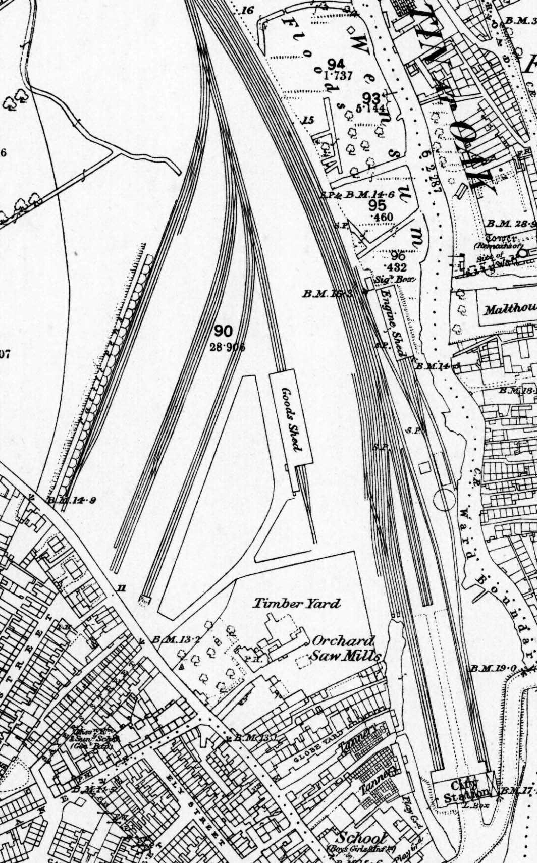 1886 1:2,500 OS map. The station shortly after construction. The original 45 foot loco turntable was in place and could be accessed from the shed end and directly from the platform run-round. The sidings for coal merchants were complete.