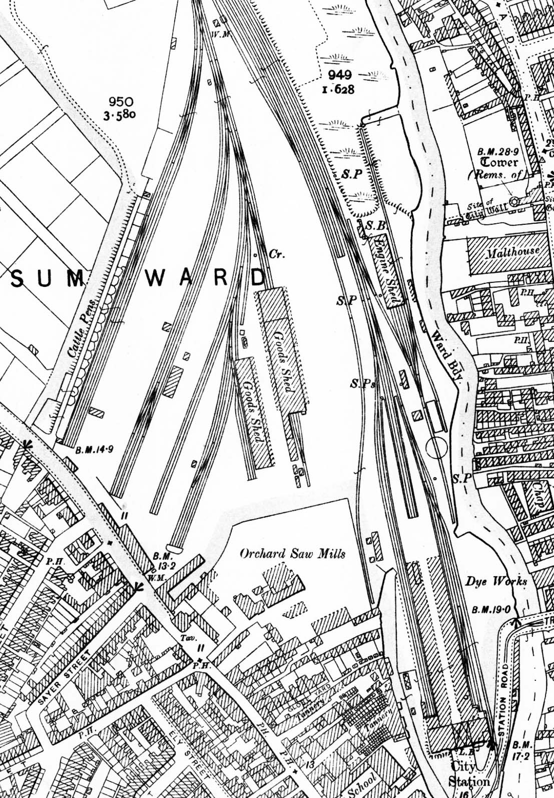 1907 1:2,500 OS map. By 1905 the goods facilities had been enhanced with a second goods shed, stables and weigh bridge and the direct platform access to the engine shed via the turntable had been removed.
