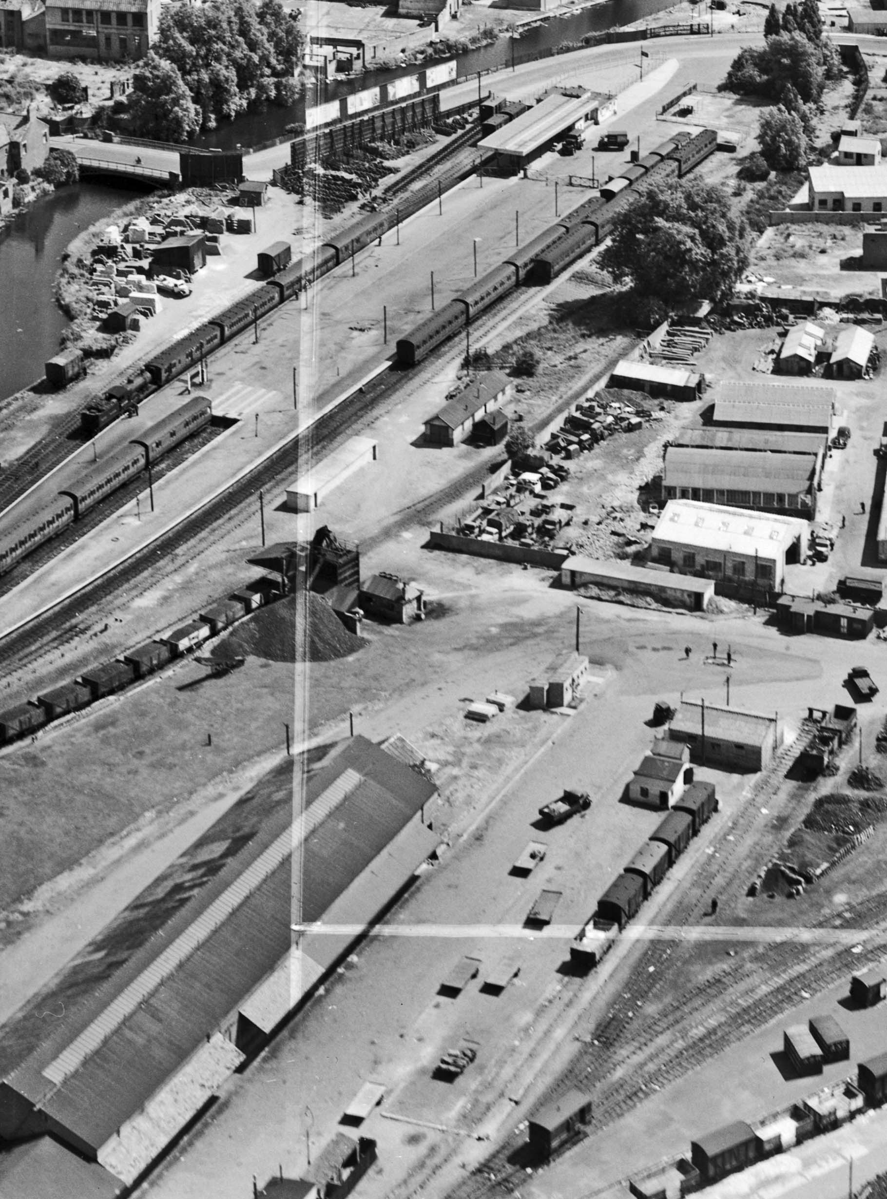 An aerial view of Norwich City station in 1949 looking towards the south-east. The post-war minimalist station buildings were in place and the platform areas, previously substantially covered by canopies, were open and offered no shelter. In the foreground the goods shed roof had been repaired following bomb damage. The locomotive in the eastern platform has possibly run round an arriving train and is about to move the empty coaches from the platform.