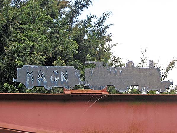 Atop the art-work is a cut-out depicting a 4-4-0 tender engine with M&GN punched out on its tender. It is out-of-scale for the odd steel structure it stands upon. May 2018.