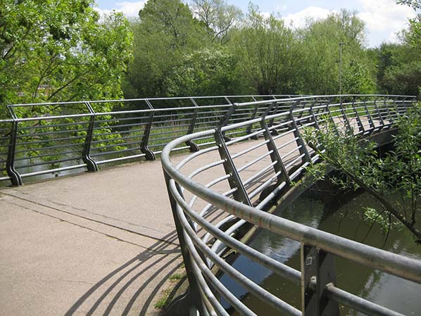 A train departing Norwich City station reached open country and joined the single track main line just before the point where the railway crossed the River Wensum. The original railway bridge was demolished by an ill-advised City Council which later replaced it with this bridge that takes Marriott’s Way along the track-bed. May 2018.