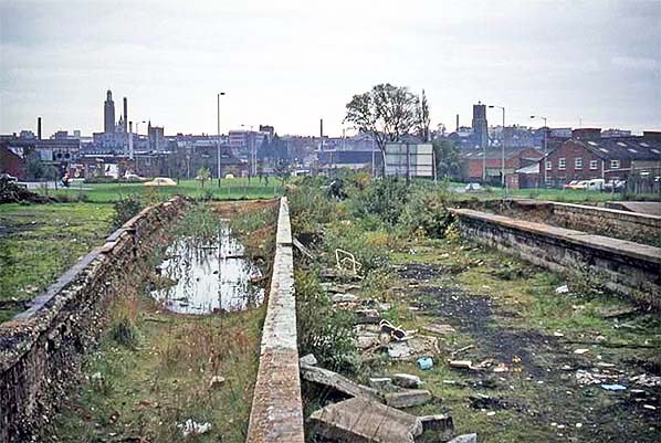 Photo by Joe Mason from his blog for memories of East Anglia ![]() In October 1976 most of the City station site had been cleared awaiting redevelopment. At this time the outer shells of the two bay platforms survived. This view is from the east bay looking towards the city centre. It clearly show the station was poorly sited some distance from the city centre.