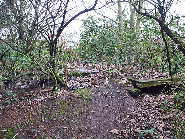 Photo by Glen Kilday At the east side of Norwich City station site the engine shed lay alongside the river. It was the second shed on the site: the first was damaged beyond repair in enemy air raids in April 1942. The engineering-brick flooring of the replacement shed was not removed after final demolition and lies hidden in the woods in May 2018.