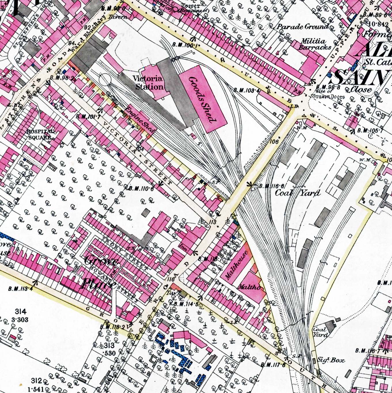 1886 1:2,500 OS map. The station is shown in its completed state, with covered platforms, engine and goods sheds and the nearby extensive coal yard all in place. There are wagon turntables shown going off each of the two goods shed roads. The small building at the convergence of the two platforms is a water tank