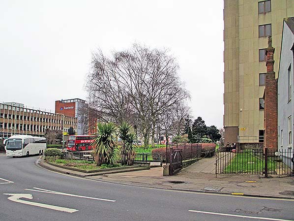 ![]() Station Name: NORWICH VICTORIA![]() Looking east along Queen’s Road from St Stephen’s Road in April 2018, the entrance to Norwich Victoria station forecourt was where the two paths meet the roadside.