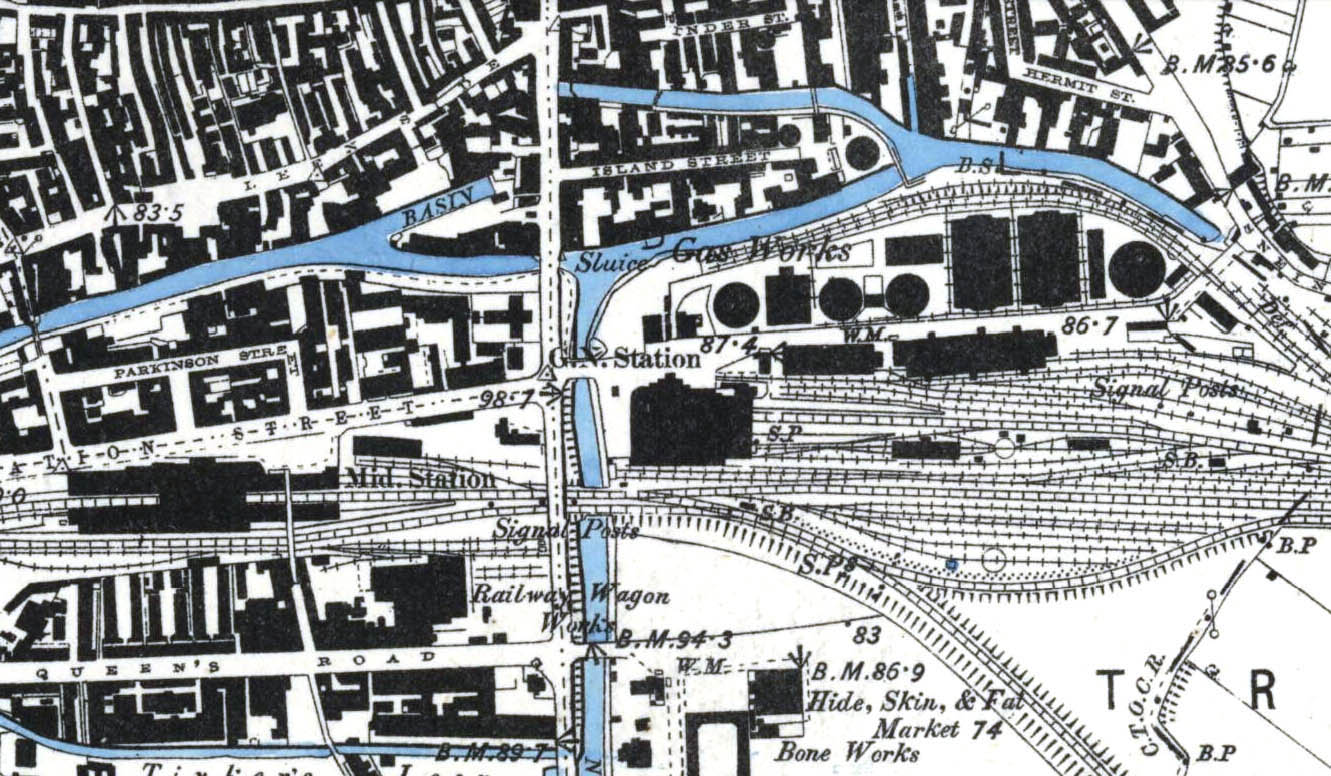 ![]() Station Name: NOTTINGHAM LONDON ROAD HL ![]() 1885 6-inch OS map shows the proximity of the Midland station seen on the left to the GNR's London Road station in the centre. At this time the High Level station and the chord linking the GNR with the Great Central, had not been built. The GNR's large corn warehouse is seen to the east of London Road station. The rail-served Eastcroft Gasworks is seen between the station and the Poplar arm of the Nottingham Canal.