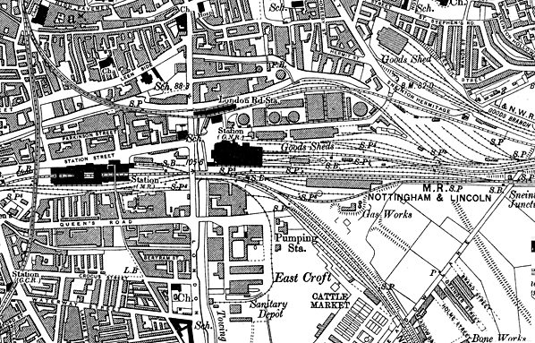 A 2-road shed immediately east of the station was opened by the Ambergate, Nottingham, Boston and Eastern Junction Railway in February 1858. It was closed by the GNR in 1906 and stood until c1920.
