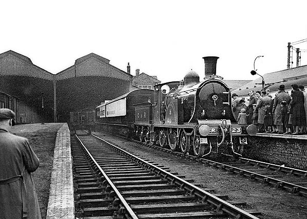 In October 1953 London Road station was host to a travelling exhibition called 'Royal Journey by Kings and Queens'. This comprised a magnificent collection of royal coaches with brocaded furnishings, a historic royal pilot locomotive and models, photographs, crest and headboards. The display gave a picture of the comfort enjoyed by kings and queens of the past hundred years. At the head of the display the Royal Pilot was Caledonian 123, built in 1886 as an exhibition loco.