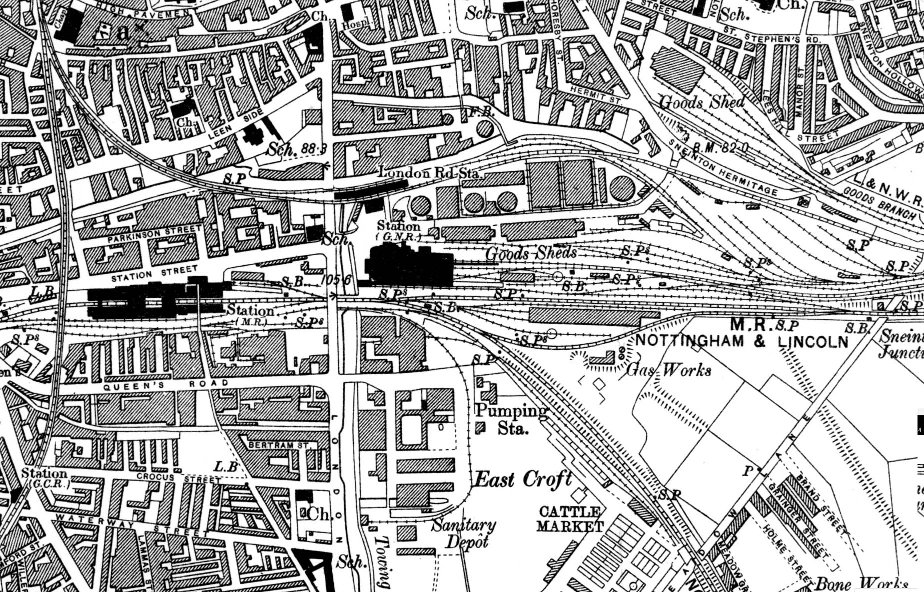 1901 6-inch OS map shows London Road High Level station which opened in 1899 on the new chord between the Great Northern and the Great Central. The LNWR goods station is seen top right. The LNWR had running rights into London Road station.