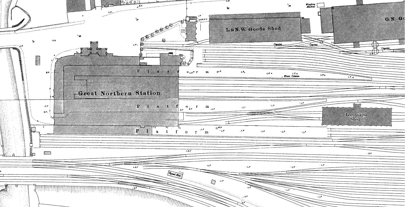 ![]() Station Name: NOTTINGHAM LONDON ROAD LL ![]() 1881 1:500 OS Town Plan clearly shows the layout of the station as built. The original trainshed covered only the west end of the station; this was later extended by the GNR. There is a two-road engine shed immediately east of the station. Although the LNWR had its own goods station nearby it also had a goods warehouse at London Road. The GNR corn warehouse is seen top right. The Midland line runs along the bottom of the map.