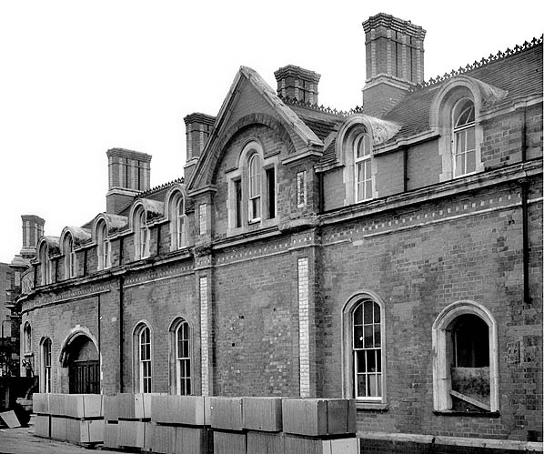 ![]() Station Name: NOTTINGHAM LONDON ROAD LL [Source: Nick Catford] ![]() Nottingham London Road Low Level station west face of the main station building in December 1980. The door on the left leads onto the station concourse without going through the booking office. There was a canopy over the forecourt to the right of the door. It was removed c1960s.