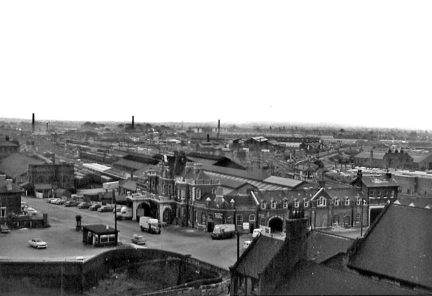A high level view of Nottingham London Road Low Level station looking east in June 1967. The canopy along the west side of the building has been removed. Note the high opening on the far right for road vehicles entering the goods shed. On the far left one end of the High Level station building is seen; to the right of that is the former LNWR goods shed and, behind that, the end of the GNR corn warehouse. Nottingham London Road Junction signal box is seen behind the station building. The Nottingham Canal is seen in the foreground.