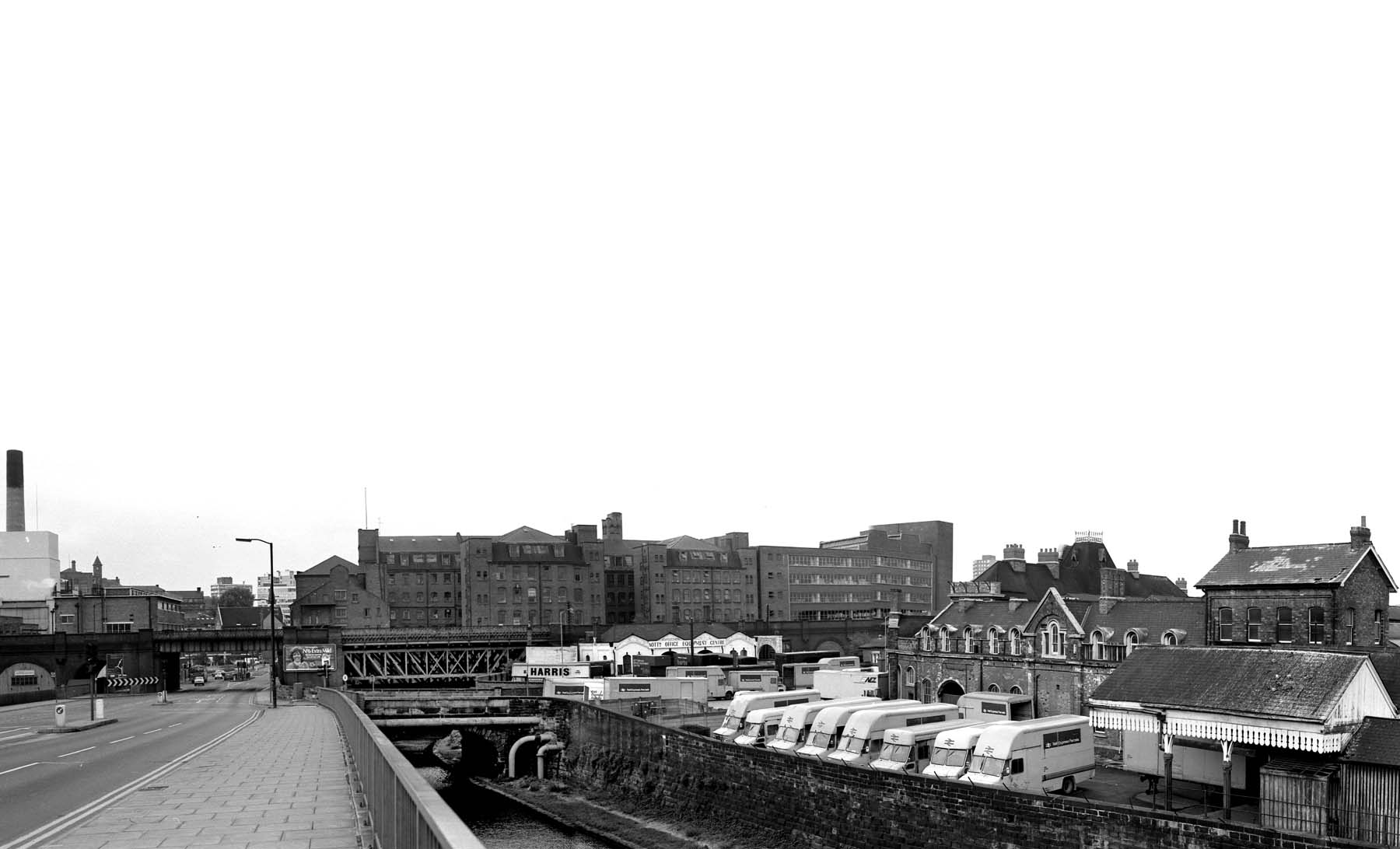 Nottingham London Road High Level panoramic merge of three images showing left to right: London Road with the Great Northern Line climbing left up to Victoria station; the canal bridge and High Level station - the white building centre; and to the right the Low Level station in use as a parcels depot. The industrial buildings in the background were part of the Boots factory complex and have been replaced by, amongst others, the BBC East Midlands studio.