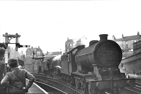 Ian Allan Locospotters Club Excursion at Nottingham Victoria Station on 24th April 1957. 60029 (seen behind) failed with the tender brakes hard on and unable to be released. 60029 was dragged off the train by 64715 and departure was 25 minutes late.