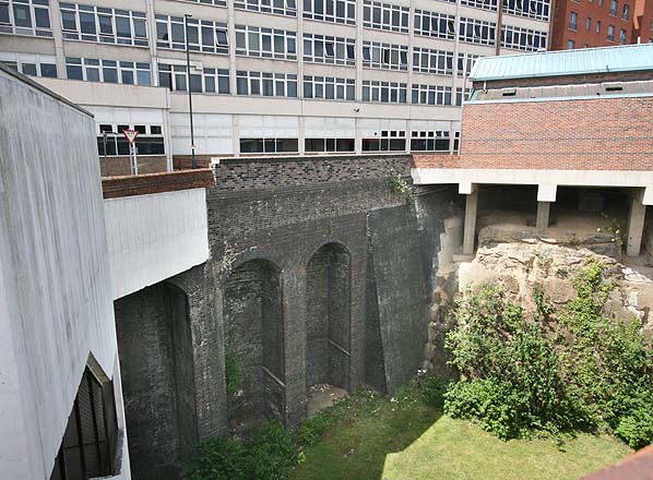 Nottingham Victoria Station was built in a deep cutting surrounded by a high brick retaining wall. Much od this wall still survives around the Victoria Shopping Centre. (June 2008)