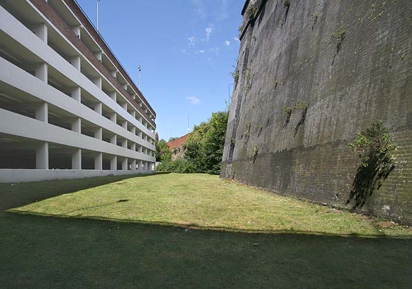The site of the north end of Nottingham Victoria Station looking north in June 2008. The south portal of Mansfield Road Tunnel can be seen in the background.