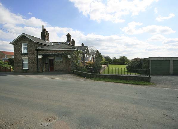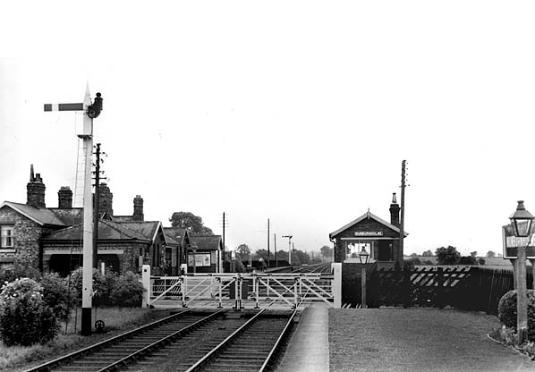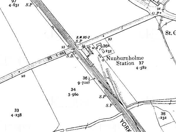 Notes: The station was originally called Burnby. Although the York - Market Weighton line opened on 4th October 1847 it is unclear when Burnby station opened. It might have been on the same date as the line, although it did not appear in public timetables until June 1848. As part of the NER policy of renaming stations whose name might have been confused with that of another station, Burnby was renamed Nunburnholme on 1st January 1873 in case it should be mistaken for Burnley in Lancashire. Burnby village was less than half a mile from the station while Nunburnholme was two miles away! Nunburnholme had staggered platforms: the down platform was south of the level crossing whilst the up platform was on the northern side. The main station building, which incorporated the stationmaster's house and booking office, was at the north end of the down platform adjacent to the level crossing. Although designed by G T Andrews it was not typical of his work and was unique to this line. It comprised a long rectangular two-storey brick house, end-on to the road, with twin gables on both sides. In front of this was a single-storey twin-gabled extension containing the booking office and waiting room. There was a recess between the two gables with an overhanging roof which formed a short canopy. The building had a small porch facing onto the road giving access into the booking office, perhaps provided for passengers travelling from Water Priory. There was a waiting shelter on the down platform but initially there was no shelter on the up platform, which caused much local controversy. In December 1847 the directors commented on its absence. Nothing was done to prevent York passengers from having to wait in the rain until, in December 1850, it was decided to dismantle one half of the waiting shed at the adjacent Shipton and re-erect it at Burnby.