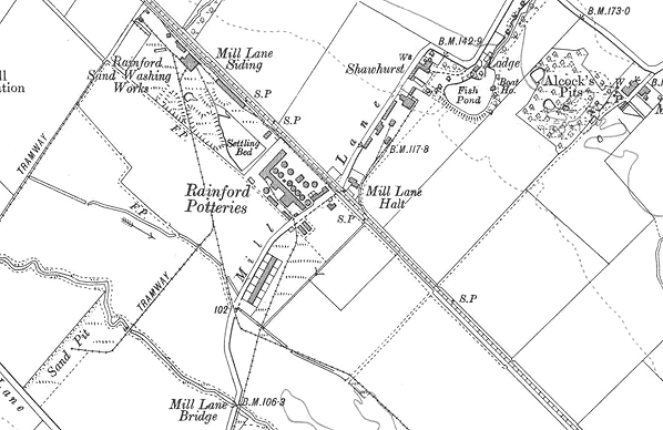 On the north side of Old Mill Lane to the west of the halt there was a pottery works that was probably the reason why the halt was provided. The works had its own siding which was directly opposite the up platform.